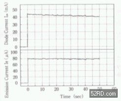 圖7是BSD電子源的emission電流時間變化特性圖,橫軸為時間,縱軸為電流密度,二極體電壓為16V,如圖所示二極體電流IPS與釋放電流Ie,不會隨著電流發(fā)生spike,亦即所謂的閃爍(flicker)現(xiàn)象,顯示BSD電子源不需外部電路,就可獲得傳統(tǒng)Spendtype電子源無法達成的特性。