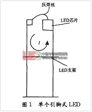 在LED引腳式封裝過程中,每個(gè)LED芯片是被固定在引線支架上的,LED芯片通過壓焊金絲(鋁絲)與引線支架形成了閉合回路,如圖1。若忽略引線支架電阻,LED支架回路光電流等于芯片光生電流IL。可見,當(dāng)p-n結(jié)材料和摻雜濃度一定時(shí),支架回路光電流與光照強(qiáng)度I成正比。