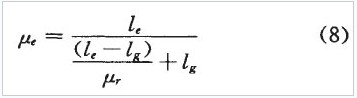 LC諧振回路中,線圈中磁芯起到增強(qiáng)磁感應(yīng)強(qiáng)度B的作用,從而增加檢測(cè)信號(hào)幅值。又線圈中磁芯的有效磁導(dǎo)率與相對(duì)磁導(dǎo)率間關(guān)系可表示為