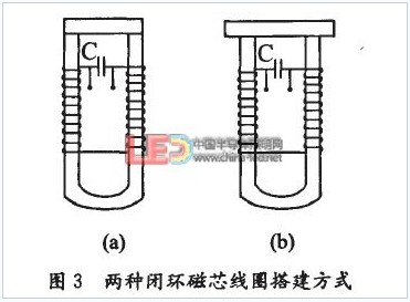 在磁芯材料確定的情況下,為了得到較大磁感應(yīng)強(qiáng)度B,需改變線圈中磁芯的結(jié)構(gòu)。若磁芯結(jié)構(gòu)設(shè)計(jì)為環(huán)形,由式(8)知,磁感應(yīng)強(qiáng)度B增大倍數(shù)理論上與磁芯的相對(duì)磁導(dǎo)率盧,大小相等,檢測(cè)信號(hào)幅值將達(dá)到最大。與條形磁芯同種材質(zhì)的u型磁芯上搭接一塊條形磁芯就構(gòu)成環(huán)形磁芯線圈,其搭接方式有兩種,如圖3示。