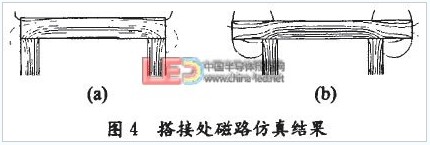 檢測(cè)時(shí)將繞有線圈的U型磁芯的一端插入圖1所示1閉合回路,感應(yīng)LED支架回路中回路電流產(chǎn)生的交變磁通,再將條形磁芯搭接在U型磁芯上,使感應(yīng)磁路閉合。由于搭接方式不同,兩種搭接方式的磁芯線圈處在支架回路所產(chǎn)生的交變磁場(chǎng)中時(shí),其搭接處磁路也將不同,用AnsoftMaxwell軟件仿真兩種搭接方式的磁芯搭接處在交變磁場(chǎng)中的磁回路,結(jié)果如圖4示