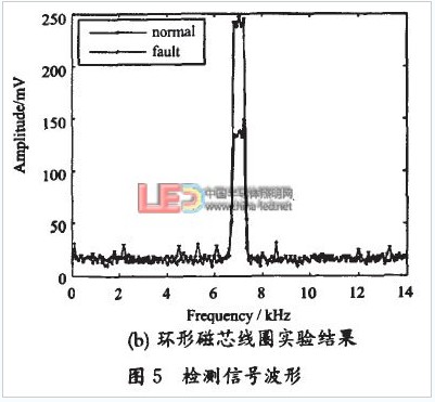 為了比較條形磁芯線圈與環(huán)形磁芯線圈對(duì)封裝缺陷檢測(cè)精度的影響,現(xiàn)分別使用條形磁芯線圈和圖3(a)示環(huán)形磁芯線圈進(jìn)行實(shí)驗(yàn)。磁芯材料為PC40,其初始相對(duì)磁導(dǎo)率約為2300,條形磁芯的外形幾何尺寸為1.6minx3.2ram×20mm,線圈匝數(shù)為300匝;環(huán)形磁芯橫截面尺寸為1.6mm×3.2mm,其有效磁路長(zhǎng)度約等于條形磁芯,線圈匝數(shù)為300匝。實(shí)驗(yàn)中激勵(lì)光源為一種超高亮度貼片式白光LED,激勵(lì)光源用占空比為50%的方波信號(hào)驅(qū)動(dòng),方波信號(hào)可由一系列正弦變化的信號(hào)疊加而成,使其基頻與諧振回路的工作頻率相同,即LC諧振回路實(shí)現(xiàn)了對(duì)方波信號(hào)的選頻,所以穿過線圈磁通鏈的變化率就是方波基頻信號(hào)的變化率;檢測(cè)對(duì)象分別是GaP材料12mil黃色焊接質(zhì)量合格的LED和焊接過程中芯片電極有非金屬膜的LED。從線圈兩端輸出的信號(hào)經(jīng)放大、濾波、峰值檢波后見圖5。實(shí)驗(yàn)中放大器的放大倍數(shù)為103倍。