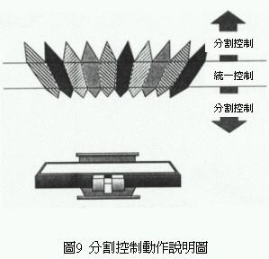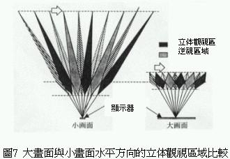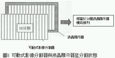 傳統(tǒng)的不需專用眼鏡的三維立體影像顯示器,同樣水平方向時小畫面的前后方向的立體可視范圍比大畫面的立體可視范圍大(圖7),這是因?yàn)樾‘嬅娴囊暯潜容^小,液晶顯示器與影像分割器較不容易產(chǎn)生所謂的moire干涉縞。利用這種物理現(xiàn)象將液晶顯示器與影像分割器,藉由電子方式分割成16等份各別掌控專屬區(qū)域(圖8)