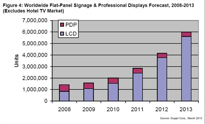 預計2010年用于數(shù)字標牌和專業(yè)顯示器的液晶(LCD)和等離子面板的全球出貨量將大增25%,達到199萬塊,而2009年是160萬塊。由于經(jīng)濟在衰退之后恢復活力,預計該產(chǎn)業(yè)在隨后幾年也會有不俗的增長,2011-2013年平均每年增長40%以上。到2013年,上述面板的出貨量將達到599萬塊。
