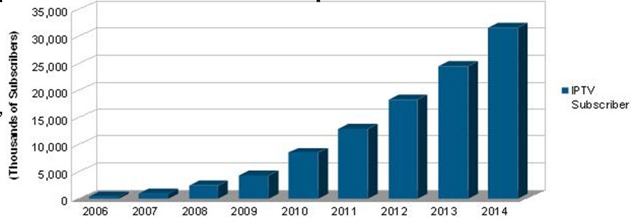 由政府推動(dòng)各家電信、廣播和互聯(lián)網(wǎng)運(yùn)營商加快覆蓋速度,中國網(wǎng)絡(luò)電視(IPTV)用戶將在未來幾年繼續(xù)快速增長(zhǎng)。