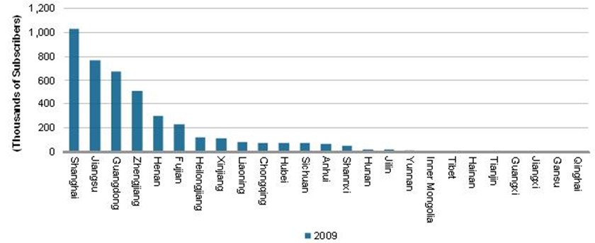 IPTV服務(wù)目前已擴(kuò)展到中國的20多個(gè)省市,但I(xiàn)PTV用戶只集中在少數(shù)幾個(gè)地區(qū)。在中國的22個(gè)省中,IPTV用戶超過10萬的不到八個(gè)。而且,全部IPTV用戶中有整整56%只集中在三個(gè)地區(qū):中國最大城市上海,以及人口密集的東部省份江蘇和南部省份廣東。