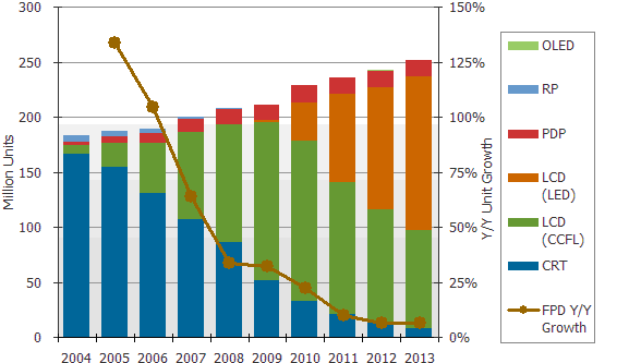 整體平面電視市場(chǎng)2009年表現(xiàn)相當(dāng)亮眼,全球出貨量成長(zhǎng)超過(guò)32%,與2008年的成長(zhǎng)率相當(dāng)接近。盡管受到經(jīng)濟(jì)蕭條影響,某些區(qū)域市場(chǎng)如日本和中國(guó)大陸2009年成長(zhǎng)率還比2008年好。對(duì)于2009年良好市場(chǎng)表現(xiàn),DisplaySearch認(rèn)為新顯示技術(shù)如3D 與LED推出有正面刺激作用;同時(shí)上修2010年全球電視出貨量預(yù)測(cè),預(yù)估今年將達(dá)2億2千800萬(wàn)臺(tái),較先前預(yù)測(cè)增加1千萬(wàn)臺(tái)。