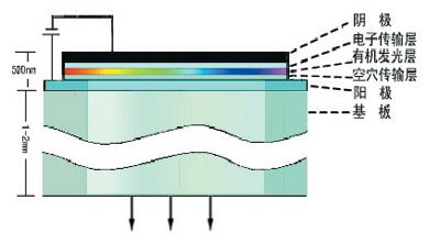 OLED是指有機(jī)半導(dǎo)體材料和有機(jī)發(fā)光材料在電場的驅(qū)動下,通過載流子注入和復(fù)合導(dǎo)致發(fā)光的技術(shù)。其原理是用ITO玻璃透明電極和金屬電極分別作為器件的陽極和陰極,在一定電壓驅(qū)動下,電子和空穴分別從陰極和陽極注入到電子傳輸層和空穴傳輸層,然后分別遷移到發(fā)光層,相遇后形成激子使發(fā)光分子激發(fā),后者經(jīng)過輻射后發(fā)出可見光。輻射光可從ITO一側(cè)觀察到,金屬電極膜同時也起了反射層的作用。下圖是一個簡單的OLED器件結(jié)構(gòu)示意圖。