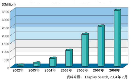 根據(jù)全球權(quán)威平板顯示器(FPD)市場調(diào)研和咨詢機(jī)構(gòu)DisplaySearch在2004年12月的最新統(tǒng)計(jì)(見表2),OLED行業(yè)2004年全年總收入為3.28億美元,比2003年增長了41%。上圖為DisplaySearch2004年2月對全球OLED市場的預(yù)測。