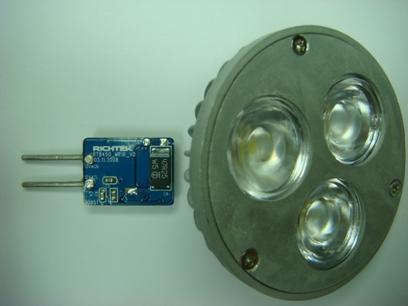 此外RT8450采用了非常小的WDFN封裝并具有4.5-40V輸入電壓范圍,這使得RT8450的驅動電路能提供很寬的驅動電壓范圍及輸入保護。RT8450的工作溫度高達125℃,可以在MR16燈具內的高溫環(huán)境中安全地工作。其500kHz的開關頻率使驅動電路可以采用小尺寸的電感和電容,另外升降壓電路架構可以將輸入濾波電容容值降低,這樣便可以將驅動電路放置在MR16燈具中,如圖2所示。