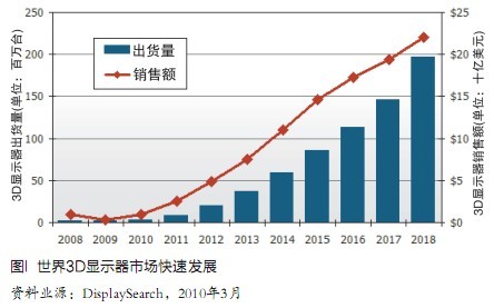 市場研究公司DisplaySearch日前發(fā)表一份專門報告稱,在3D電影成功的促動下,3D顯示器市場將于2010年開始起飛,預測3D顯示器出貨量將從2008年的70萬個增長到2018年的1.96億個,10年內年均增長率達75%,同期銷售額從9億美元增長到220億美元,年均增長率38%(圖1)。世界消費電子廠商將隨著推出一批3D有關產(chǎn)品,包括電視機、監(jiān)視器、筆記本電腦、藍光盤播放器、數(shù)碼相機、攝像機、相框等進軍家庭市場。加上立體顯示原來就有的醫(yī)療等專業(yè)應用以及廣告、公共顯示牌等應用,都會成為促動顯示產(chǎn)業(yè)開始從平板產(chǎn)品向著3D大進軍,這也是一次從平板顯示轉向立體顯示的革命。