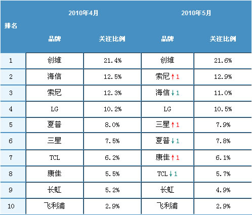 (圖)2010年5月中國(guó)液晶電視市場(chǎng)最受用戶關(guān)注的十大品牌