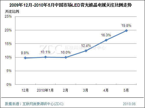 (圖)2009年12月-2010年5月中國(guó)市場(chǎng)LED背光液晶電視關(guān)注比例走勢(shì)