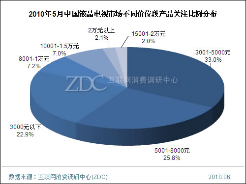 5月,3001-5000元的液晶電視產(chǎn)品吸引了33%的消費(fèi)者關(guān)注度,較上月升高了0.5%,而3000元以下的入門(mén)級(jí)液晶電視產(chǎn)品吸引了22.9%的消費(fèi)者關(guān)注度,較上月提高了2.6%。而5001-8000元價(jià)位段的大中尺寸液晶電視的消費(fèi)者關(guān)注比例較上月減少了4.1%。