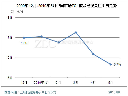 2009年,TCL在互聯(lián)網(wǎng)電視領(lǐng)域表現(xiàn)不俗,全年TCL液晶電視全球銷(xiāo)量為842萬(wàn)臺(tái),同比增長(zhǎng)了101%。在2010年第一季度TCL的品牌關(guān)注比例走勢(shì)平穩(wěn),但4月開(kāi)始其品牌關(guān)注比例有小幅下滑,5月已經(jīng)下滑至5.7%,排名下滑兩位。