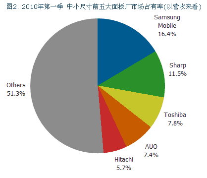 Samsung Mobile Displays 不論在出貨量和營(yíng)收上都維持穩(wěn)定地位,分別在全球市場(chǎng)擁有11.8%和16.84的市場(chǎng)占有率,同時(shí)在手機(jī)所需的TFTLCD和AOMLED面板上都有很高的出貨量。Sharp的營(yíng)收在2010年第二季呈現(xiàn)大幅下滑,這是因?yàn)橄噍^于競(jìng)爭(zhēng)對(duì)手而言,市場(chǎng)上對(duì)于可攜式游戲機(jī)等裝置的需求下跌所致。 Toshiba的營(yíng)收沒(méi)有像競(jìng)爭(zhēng)對(duì)手下滑這么多,這是因?yàn)楦叻直媛适謾C(jī)和汽車用顯示器的需求增加所致。