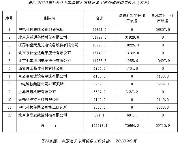 據(jù)協(xié)會副秘書長金存中介紹,晶硅太陽能行業(yè)的快速增長是眾多設(shè)備企業(yè)快速發(fā)展的關(guān)鍵。占電子專用設(shè)備銷售收入一半的半導(dǎo)體設(shè)備,今年上半年銷售收入比去年同期增長了50.3%,達(dá)到16.79億元,這主要來自上半年光伏產(chǎn)業(yè)對晶硅太陽能設(shè)備需求的增長。上半年半導(dǎo)體設(shè)備的銷售收入中,晶硅太陽能設(shè)備占79.5%,達(dá)到13.34億元。其中,晶硅材料生長加工設(shè)備7.37億元,電池芯片生產(chǎn)設(shè)備5.97億元。