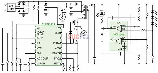 圖2:基于NCP1607和NCP1397的街道照明高能效LED電源方案。