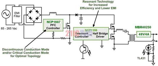 2)基于NCP1607和NCP1397的超高能效大功率LED街燈電源方案近年來,業(yè)界對超高能效的LED照明拓撲結(jié)構(gòu)興趣日濃,期望在功率電平相對較低(<50W)時提供高于90%的能效,這個能效目標甚至比“能源之星”2.0版外部電源能效要求(功率不超過49W時能效高于87%)更高。要達到這樣高的能效,需要采用新的拓撲結(jié)構(gòu),如從反激拓撲結(jié)構(gòu)轉(zhuǎn)向諧振半橋拓撲結(jié)構(gòu),從而充分發(fā)揮零電壓開關(guān)(ZVS)的優(yōu)勢。有利的是,安森美半導(dǎo)體早已著手開發(fā)能用于LED驅(qū)動電源的高能效半橋解決方案,如NCP1396及其升級版NCP1397高性能諧振模式控制器。NCP1397內(nèi)置高端和低端驅(qū)動器,支持可調(diào)節(jié)及精確的最低頻率,提供極高能效,并具備多種故障保護特性?;贜CP1607PFC控制器和NCP1397雙電感加單電容(LLC)半橋諧振控制器的LED電源方案(見圖2)非常適合功率在50到300W范圍的高能效LED街道照明應(yīng)用。[page]