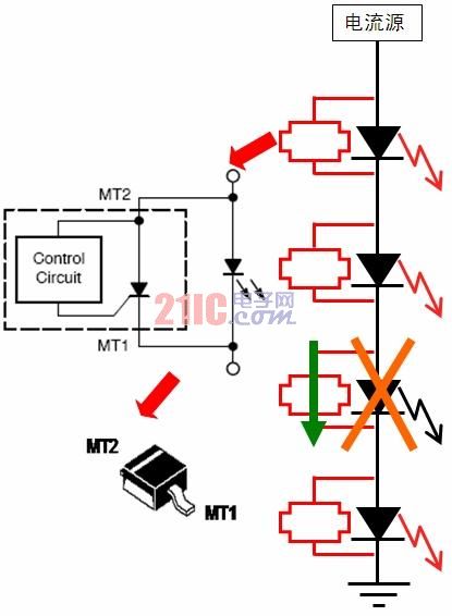 增強LED串可靠性的保護方案如前所述,區(qū)域照明應(yīng)用中通常會采用多串LED。雖然LED本身的可靠性很高,但如果LED串中的某個LED發(fā)生開路故障,那么整串LED就可能關(guān)閉,而街道照明等應(yīng)用中就要避免這種狀況,從而降低后期維護成本。有鑒于此,安森美半導(dǎo)體推出了NUD4700 LED電流旁路保護器(見圖3)。這器件是一款分流器件,萬一LED串中某個LED開路,則會提供電流旁路,確保在某個LED故障的條件下整串LED不會關(guān)閉;而且恰當(dāng)處理散熱的話,還可支持大于1 A的大電流。