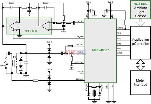 有利的是,設(shè)計人員采用安森美半導(dǎo)體的AMIS-49587電力線載波(PLC)調(diào)制解調(diào)器、PLC線路驅(qū)動器NCS5650和諸如NOA1302這樣的環(huán)境光傳感器,基于電力線輕易地構(gòu)建聯(lián)網(wǎng)型LED街燈智能控制系統(tǒng)(參見圖4)。其中,安森美半導(dǎo)體的環(huán)境光傳感器包含的輸出類型,如NOA1302和NOA1305提供的是數(shù)字輸出,而NOA1211為模擬輸出。這些光傳感器的工作電流極低,在100流明光輸出條件下分別僅為58 μA、550 μA和115 μA,因而對系統(tǒng)能效的影響極小。