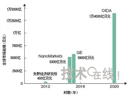 圖有機(jī)EL照明/光源市場(chǎng)到2020年將占到照明市場(chǎng)整體的2成圖為針對(duì)包括普通照明、特殊照明及背照燈等在內(nèi)的有機(jī)EL照明今后的市場(chǎng)規(guī)模,日本矢野經(jīng)濟(jì)研究所、NanoMarkets、GE及OIDA發(fā)布的預(yù)測(cè)及目標(biāo)。市場(chǎng)規(guī)模方面,預(yù)計(jì)2015年全球?qū)⑦_(dá)到5000多億日元,到2020年將大大超過(guò)1萬(wàn)億日元。