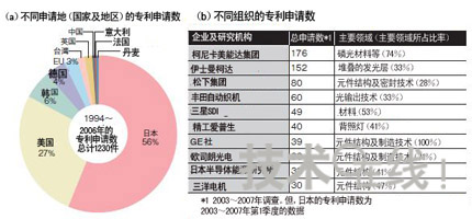 圖日本廠商在開(kāi)發(fā)方面領(lǐng)先圖為Cintelliq公司就以實(shí)現(xiàn)有機(jī)EL照明為目的的專利申請(qǐng)數(shù)所做調(diào)查的結(jié)果。按申請(qǐng)地劃分,日本為56%,大大超出排在第2位的美國(guó),遙遙領(lǐng)先(a)。在本圖中,1994~2006年的專利申請(qǐng)數(shù)通過(guò)2003年以后的文獻(xiàn)調(diào)查得到。按不同組織劃分,柯尼卡美能達(dá)集團(tuán)為176件,排在第1位(b)。大約3/4的專利與藍(lán)色磷光材料有關(guān)。(b)為2003~2007年有機(jī)EL照明(包括背照燈)專利按組織劃分的申請(qǐng)數(shù)(前10家公司)及主要領(lǐng)域。由于按組織劃分的日本專利申請(qǐng)數(shù)數(shù)據(jù)中不包含2007年第2季度以后的數(shù)據(jù),因此,實(shí)際上日本企業(yè)的申請(qǐng)數(shù)有可能更多。