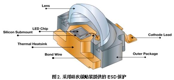 圖2顯示了如何在LED和引線框之間應(yīng)用硅次級貼裝來更緊密地集成ESD保護。這種構(gòu)造使LED外形尺寸更緊湊;次級貼裝替代側(cè)面貼裝LED模塊中使用的傳統(tǒng)襯底,提供的ESD保護等級超過15 kV HBM。硅次級貼裝的良好熱傳導(dǎo)性也幫助LED緩解由于LED與引線框熱膨脹系數(shù)不同導(dǎo)致的應(yīng)力。
