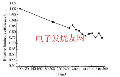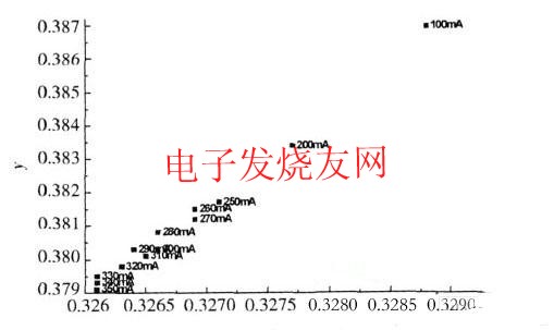 現(xiàn)在LED的發(fā)光顏色越來(lái)越豐富,LED的色坐標(biāo)參數(shù)是LED重要的物理參數(shù)之一,隨著注入電流的增加,器件出光的色坐標(biāo)在一定程度上減小,如圖1所示。