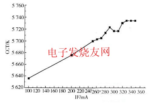 從圖2中可以看出,隨著器件的驅(qū)動(dòng)電流增加,功率型白光LED的色溫從100mA電流時(shí)的5636K增加到350mA電流時(shí)的5734K。這是因?yàn)?,電流加大后,芯片發(fā)出的藍(lán)光增多,熒光粉層的厚度是一定的,則在出射的白光中藍(lán)光成份增加,從而使器件的色溫增加。