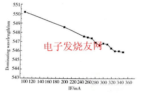 隨著電流增加,器件出光的主波長(zhǎng)在減小,這是因?yàn)殡娏髟黾?,色坐?biāo)減小,標(biāo)準(zhǔn)白光點(diǎn)和色坐標(biāo)點(diǎn)的連線(xiàn)的延長(zhǎng)線(xiàn)與380~760nm的光譜軌跡相交點(diǎn)對(duì)應(yīng)的波長(zhǎng)值變小。