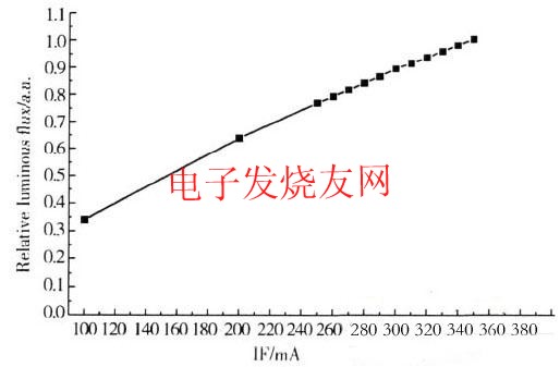 發(fā)光二極管在調(diào)節(jié)光通量方面具有一定的優(yōu)勢(shì),器件的光通量隨著電流增加而增加,在100mA~250mA,光通量增加率為126.2%;從250mA~350mA時(shí),電流的增加輻度較小且呈非線(xiàn)性增加,增加率為30.4%。PN結(jié)是發(fā)光二極管的核心部分,電流增加后,注入到發(fā)光區(qū)的電子和空穴數(shù)量增加,發(fā)生輻射復(fù)合的數(shù)量也會(huì)增加,器件的光通量增加。但當(dāng)注入電流繼續(xù)增加到某一值時(shí),光通量輸出不再增加,趨于飽和。