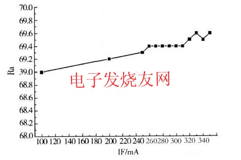 由于藍(lán)光LED與$熒光粉組成的白光系統(tǒng),其光譜中缺少紅光成分,顯色指數(shù)還不理想,這也是目前業(yè)界研究的重點(diǎn)課題。顯色指數(shù)與光譜成分有關(guān),電流增加但并不影響出光的光譜的分布,所以器件的顯色指數(shù)幾乎沒(méi)有變化。
