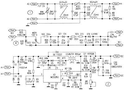 MC33262是一款可靠且成本低廉的功率因數(shù)校正芯片,其應(yīng)用電路如圖2所示。市電經(jīng)電源濾波器和整流器得到脈動(dòng)直流電。電流通過(guò)啟動(dòng)電阻R10向C2充電至10V時(shí),IC1開(kāi)始工作。整流后的直流脈動(dòng)電壓在R5的分壓作為取樣信號(hào)經(jīng)IC1的③腳輸入乘法器。