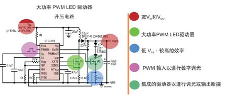 在高電流情況下驅動LED要求有一個DC/DC控制器,以精確地調整電流,確保一致的光密度和顏色的統(tǒng)一性,并保護LED。此外,一個巨大的挑戰(zhàn)是利用電池電壓為一或幾串LED供電,電池電壓可以小于、等于或大于其負載電壓。另一個考慮是要有效地對大調光比率的LED進行調光,同時維持其在低和高亮度水平上的色彩特性。此外,DC/DC驅動器的有效運行是一個關鍵因素,特別是在驅動高亮度LED時,因為所有沒有用來照明的功率將成為熱損耗。