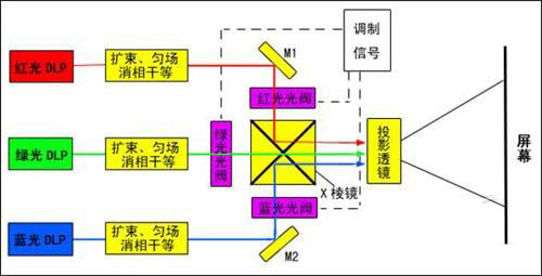 激光顯示系統(tǒng)主要由三基色激光光源、光學引擎和屏幕三部分組成。光學引擎則主要由紅綠藍三色光閥、合束X棱鏡、投影鏡頭和驅(qū)動光閥組成,光閥驅(qū)動使光閥上分別生成紅、綠、藍三色對應(yīng)的小畫面,然后分別引入三色激光照明投影到屏幕上,即產(chǎn)生全色顯示圖像。充當光閥及驅(qū)動源的可以是各種微型顯示系統(tǒng)、如LCD,LCoS,DMD,GLV等。