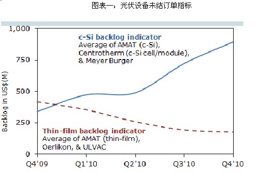 隨著2011年所公布的超越60%年度增長(zhǎng)率的產(chǎn)能的擴(kuò)張,首選設(shè)備供應(yīng)商的訂單使得未結(jié)訂單總量創(chuàng)下新記錄,超過(guò)了2008年由高價(jià)格交鑰匙薄膜生產(chǎn)線業(yè)務(wù)推動(dòng)的水平。2010年第四季度末,有20家設(shè)備供應(yīng)商的訂單積累已經(jīng)超過(guò)了1億美金,這些訂單主要的出貨時(shí)間集中在2011年上半年。目前的未結(jié)訂單總量與2009年第四季度相比有26%的增長(zhǎng),導(dǎo)致2010年的訂單出貨比原高于上一年水平(1.24),其中2010年第二季度的更是創(chuàng)下了1.7的八季高點(diǎn)。