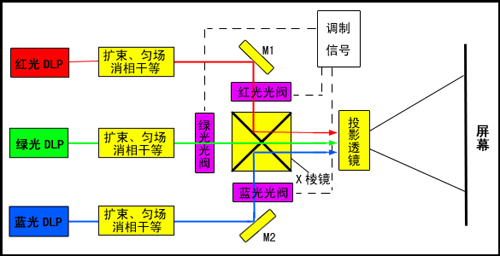 以投影方式為激光顯示解決方案的工作原理如圖1.1所示:紅、綠、藍(lán)三色激光分別經(jīng)過擴束、勻場、消相干后入射到相對應(yīng)的光閥上,光閥上加有圖像調(diào)制信號,經(jīng)調(diào)制后的三色激光由X棱鏡合色后入射到投影物鏡,最后經(jīng)投影物鏡投射到屏幕,得到激光顯示圖像。