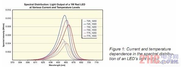 LED的光輸出特性主要取決于其工作條件。前向電流增加會(huì)使LED產(chǎn)生更多的光。但當(dāng)前向電流保持不變,光輸出會(huì)隨著LED的溫度升高而下降。圖1描述了溫度,電流和光輸出的關(guān)系。并且描述了一個(gè)LED相關(guān)的顏色光譜在峰值波長處的偏移。用于普通照明的單色LED,藍(lán)色光譜的峰值會(huì)發(fā)生偏移,因此改變了LED所謂的色溫。這會(huì)對(duì)LED照明空間內(nèi)的感官產(chǎn)生影響。