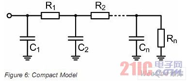 結(jié)構(gòu)函數(shù)可以進(jìn)一步轉(zhuǎn)變成簡(jiǎn)化模型,也就是一個(gè)包含熱阻熱容的等效網(wǎng)絡(luò),它包含了結(jié)構(gòu)函數(shù)圖形中所包含的所有數(shù)值。圖6描述了類似功率LED等半導(dǎo)體元件的一個(gè)通用模型。當(dāng)然,實(shí)際的模型中R和C會(huì)有具體的數(shù)值。