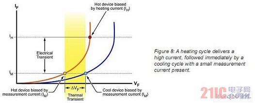 注意,當(dāng)PN結(jié)前向電流突然被停止(在測(cè)試過程中),不可避免的發(fā)生電瞬態(tài)現(xiàn)象。這個(gè)瞬態(tài)現(xiàn)象會(huì)持續(xù)很短的一段時(shí)間,在這段時(shí)間內(nèi)前向電壓的改變無法描述LED芯片的溫度的改變。因此,在進(jìn)行測(cè)量時(shí)必須給電瞬態(tài)現(xiàn)象消失留有一個(gè)時(shí)間上的延遲。