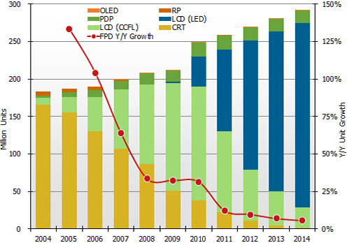 - 預(yù)計(jì)總體液晶電視出貨量將穩(wěn)步增長(zhǎng),到2014年達(dá)到2.7億臺(tái)