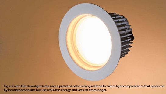 另外,LED輸出水平已經(jīng)達到150流明/瓦,而且還在繼續(xù)上升。幾家LED廠商生產(chǎn)的高亮度LED,可以提供顏色范圍較寬的照明。例如,Cree公司生產(chǎn)的LR6筒燈,采用了獲得專利的顏色混合方法,所發(fā)出的光可以媲美白熾燈,但功耗要比白熾燈減少85%,而壽命是它的50倍。