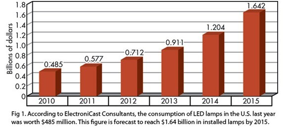 ElectroniCast Consultants最近公布的市場研究報告認為,去年美國消費的LED燈泡價值4.85億美元。該公司預(yù)測,以2015年該數(shù)字將達到16.4億美元。