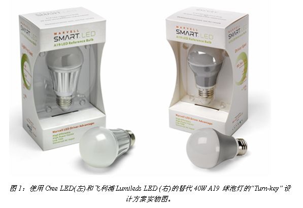 目前Marvell公司提供的超低功耗A19型交鑰匙設(shè)計方案和燈泡實(shí)物包括兩種(見圖1),均可用于替代40W的A19型球泡白熾燈:一種是采用4顆照明級別Cree XLamp® XP-E高效白光LED的方案;另一種是采用飛利浦Lumileds LUXEON® A LED的方案。此外,Marvell還推出了采用Cree XLamp® MT-G產(chǎn)品的PAR38射燈交鑰匙解決方案,用于替代100W的傳統(tǒng)此類燈具。同時,Marvell還在開發(fā)A19 60W等效LED燈泡方案,很快也將與中國客戶見面。