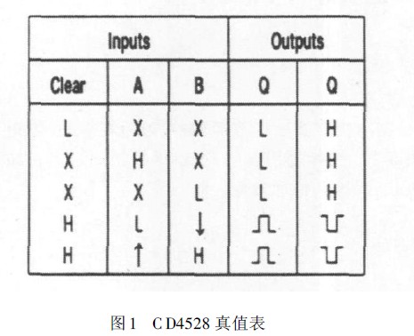 CD4528含兩個(gè)單穩(wěn)態(tài)觸發(fā)器,其真值表如圖1。芯片3腳與13腳分別為其內(nèi)部兩個(gè)獨(dú)立單穩(wěn)態(tài)電路的Clear 端,5腳和11腳為單穩(wěn)態(tài)的B輸入端,4腳與12腳為單穩(wěn)態(tài)的A輸入端。B端接高電平,只有當(dāng)Clear端為高電平時(shí),A端輸入的上升沿觸發(fā)才會(huì)有效。