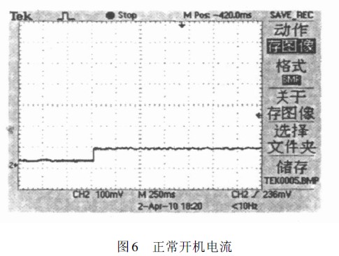 開機(jī)時(shí),由于電源濾波電容大,以及各延遲環(huán)節(jié)使得電流采樣反饋值與給定值在調(diào)節(jié)器輸入端不同,這會(huì)使得負(fù)載電流上升過沖,實(shí)測過沖波形如圖5所示。 為了解決這一問題,可以將調(diào)節(jié)器給定端RC 的值適當(dāng)加大,調(diào)節(jié)以后的開機(jī)電流沒有發(fā)生過沖,波形如圖6.