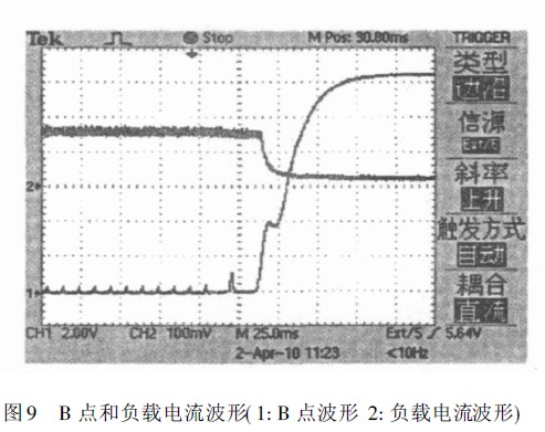 光耦U1、U 2 隨被測電源的正負(fù)半周交替導(dǎo)通,當(dāng)A 點(diǎn)交流電壓大于光耦中發(fā)光二極管的導(dǎo)通電壓Von時(shí),光耦開啟,C3通過光耦中三極管放電,使B 點(diǎn)的電壓達(dá)不到場效應(yīng)管的開啟電壓; 當(dāng)交流電壓小于Von時(shí),光耦不導(dǎo)通,C3充電,B點(diǎn)的電壓增加,此時(shí)應(yīng)使C3的電壓上升到場效應(yīng)管閾值的時(shí)間大于光耦關(guān)閉的時(shí)間,以保證Q2不導(dǎo)通。 在t1時(shí)刻交流電源斷開,光耦輸出呈高阻態(tài),C2中存儲(chǔ)的電荷經(jīng)R1向C3充電,C3上的電壓迅速增加,當(dāng)B點(diǎn)電壓大于場效應(yīng)管的開啟電壓時(shí),場效應(yīng)管Q2導(dǎo)通,導(dǎo)通后可迅速將Vs 拉低,圖8中Vs是調(diào)節(jié)器的給定輸入端電壓。 關(guān)機(jī)瞬間負(fù)載電流和圖8中B點(diǎn)的波形如圖9。改變R1和R4的參數(shù),可以改變給C3充電的時(shí)間。 R4選用較大阻值的,可以提高C3上的電壓,同時(shí)延長C3的放電時(shí)間。 C2的大小可以決定交流電源斷電后維持該電路工作的時(shí)間。 綜上所述,設(shè)置合理的參數(shù),便可保證在主電路電源沒有完全關(guān)閉的情況下,Q2一直導(dǎo)通,即誤差放大器的給定輸入端一直為零,避免了電流過沖。