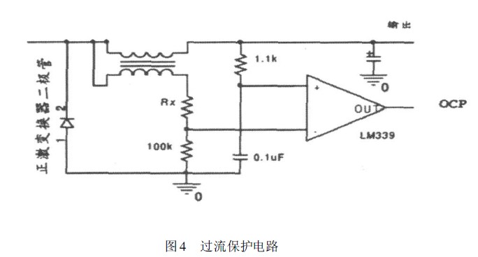 這里采用如圖4的方法,在正激變換器扼流圈放置相同匝數(shù)的線徑較細(xì)的線圈。 這兩個(gè)繞組是磁平衡的,它們之間本應(yīng)沒有電壓差。 但是主繞組有直流電阻,大電流時(shí)產(chǎn)生了微小的電壓差,該電壓差由負(fù)載電流決定。這個(gè)微小的電壓差被運(yùn)放檢測,并且通過調(diào)節(jié)Rx可以設(shè)置電流限制。該電路的缺點(diǎn)是電流限制不是很精細(xì)的,這是因?yàn)殂~電阻在溫度每上升10℃時(shí)增加4%。但是這個(gè)電路依然可以滿足我們的設(shè)計(jì)要求。