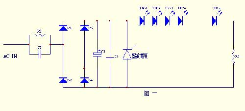 在圖三電路中﹐C1﹑R1﹑壓敏電阻﹑L1﹑R2組成電源初級(jí)濾波電路﹐能將輸入瞬間高壓濾除﹐C2﹑R2組成降壓電路﹐C3﹑C4﹑L2﹑及壓敏電阻組成整流后的濾波電路。此電路采用雙重濾波電路﹐能有效地保護(hù)LED不被瞬間高壓擊穿損壞。